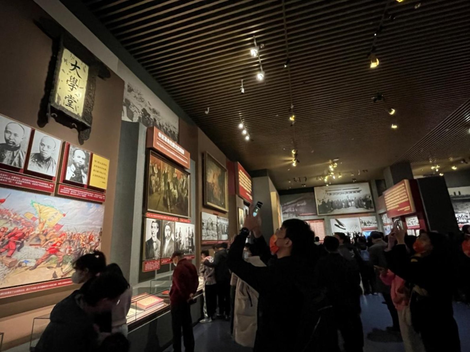 展览馆内珍贵的文物实物、详实的档案资料、生动的图片视频以及逼真的复原景观令参观者身临其境、感同身受。寻回的圆明园兽首、阅兵仪式的检阅车,马克思的手稿真迹、爱国运动时期的刊物,创办经济特区图片、开国大典影像资料,这一件件珍贵的文物资料,同学们纷纷驻足,回顾着当年的峥嵘岁月,感慨良多。中共一大、遵义会议等的复原景观历历在目,红军战士过索桥、翻雪山的历史场景栩栩如生,这一段段历史不再是历史书上简单的几段文字,而是呈现在所有人面前的生动史实,切实体会到一代代先辈们的伟大与智慧。